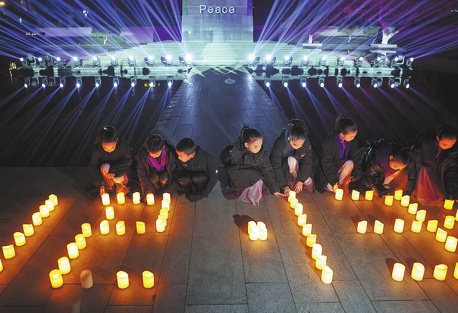 Children attend a candlelight vigil at the memorial hall in Nanjing on Saturday. WANG ZHUANGFEI/CHINA DAILY