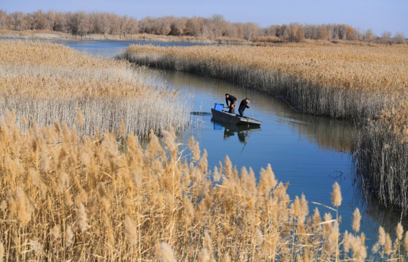 工作人员在策勒县沙海玉湖下网捕捞螃蟹。锁边汤永 摄