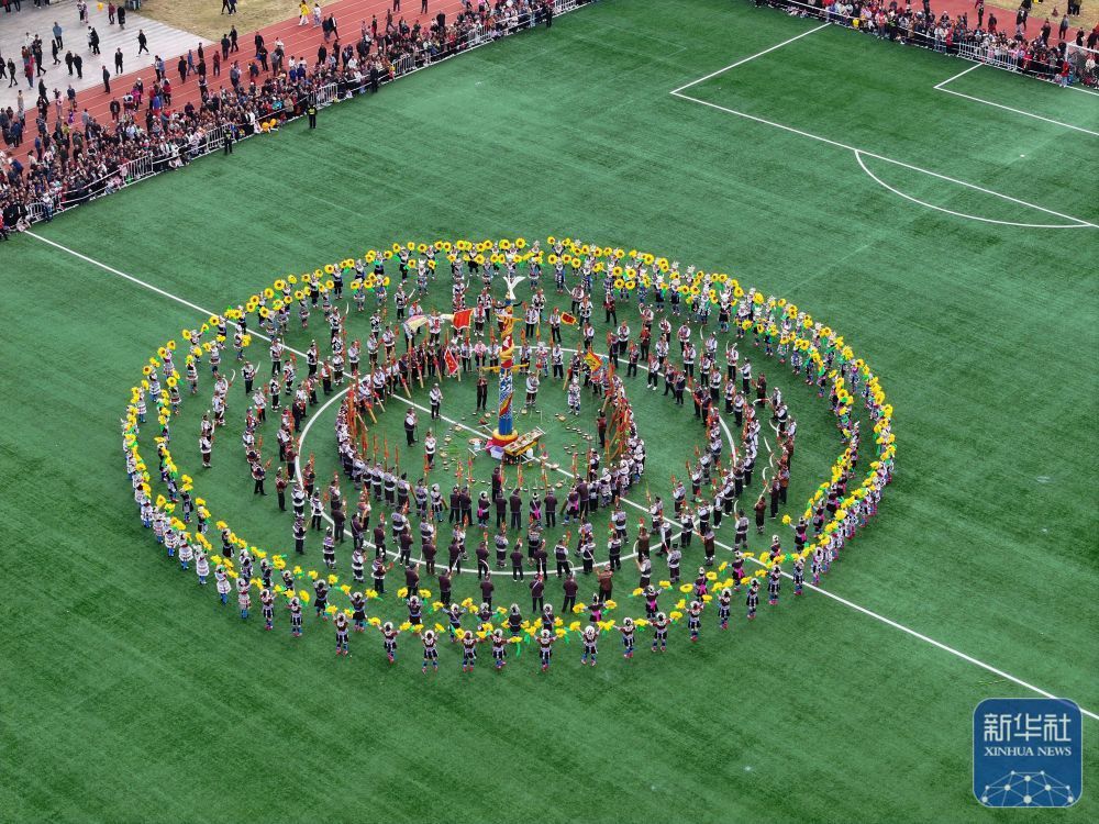 ↑在融水县香粉乡十六古龙坡会上,当地群众在参与芦笙踩堂(2025年2月13日摄,无人机照片)。新华社发(郑昌昊摄)