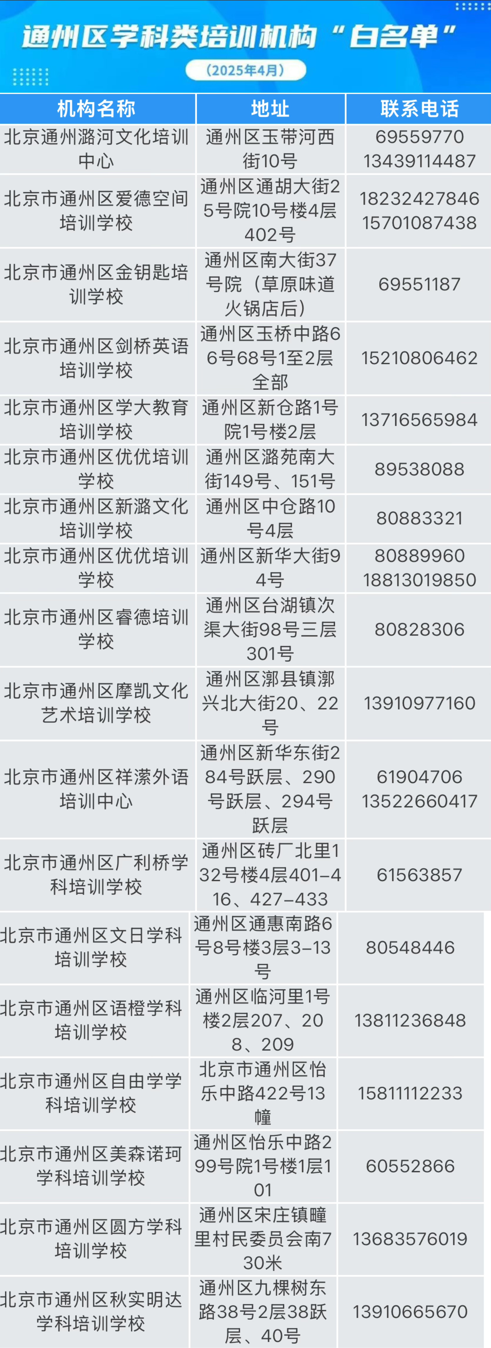 通州区18家列入“白名单”的合规机构名单。 图/北京市通州教委公众号