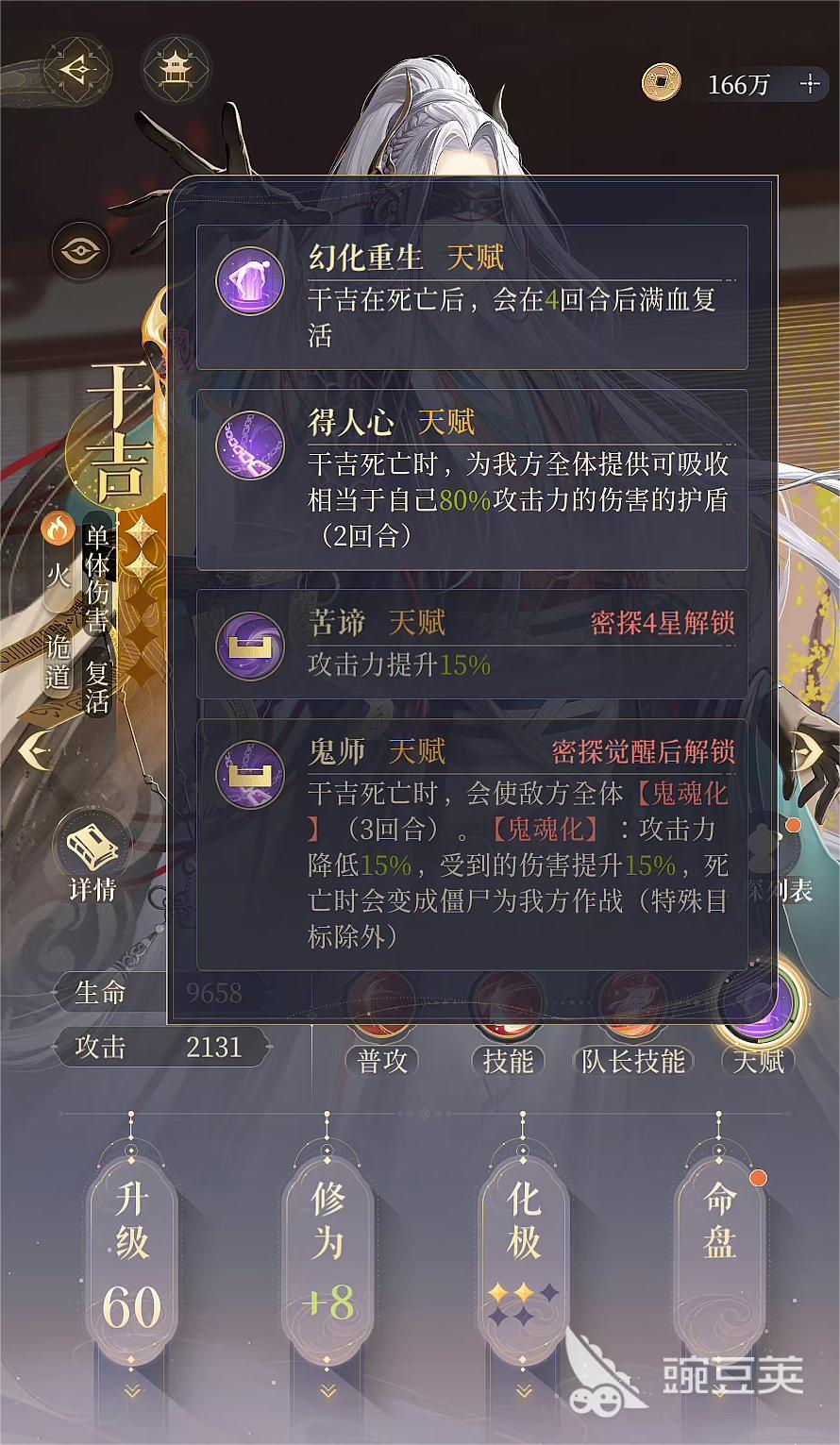 干吉的队长技能可以为我方队友提升技能攻击伤害,比较中规中矩的一个技能,如果干吉练度没上来的话,队长的位置还是不要给他了。接下来就是干吉的天赋,干吉的天赋还是很实用的,只要场上还有队友存活,那干吉就可以满血复活,而且能量也不会消失。
