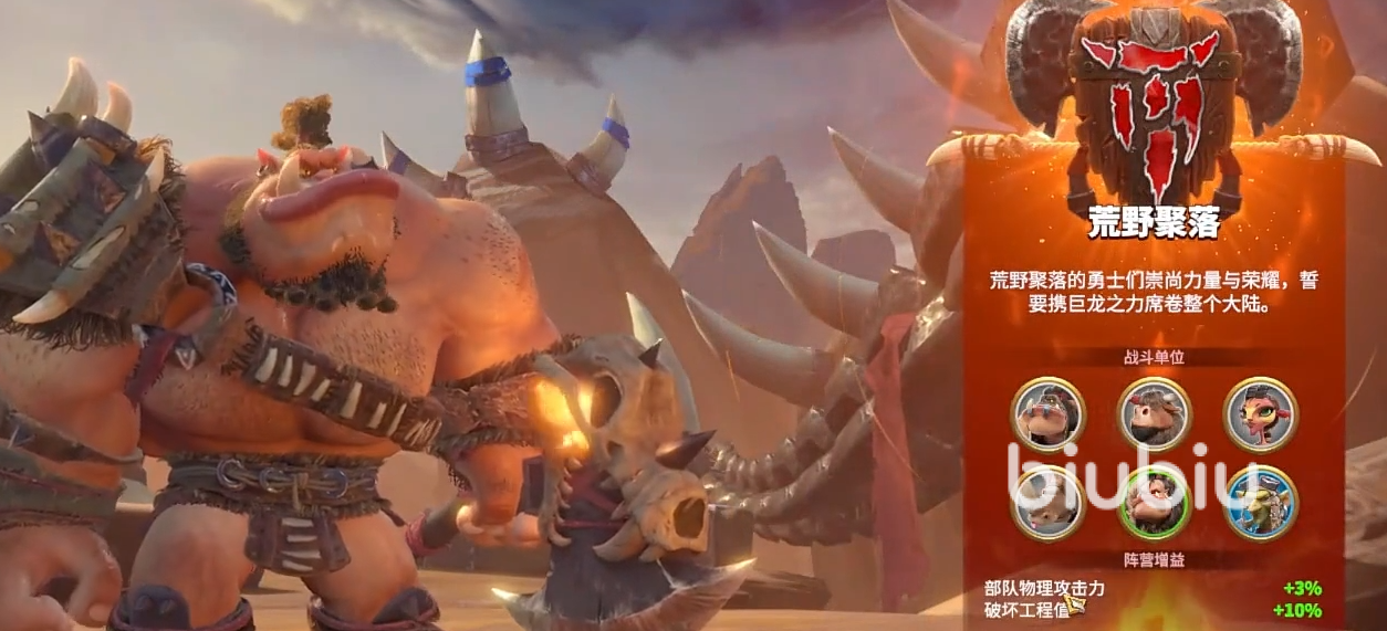 最后的兽族是属于血防较高。他们的天赋是增加收获的产值。这个能力是属于越后期越有用。兽族本身的移动速度不算快,但是他们的步兵除了速度外整体的属性都不算低,在前期的攻防中有着优势。