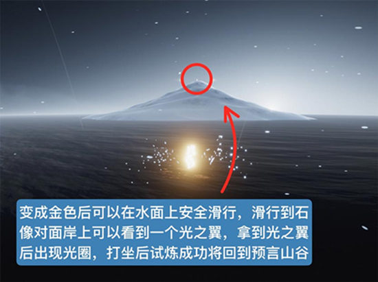进入水试炼后,位置在冰块上面跑酷,光遇到终点打坐后出现小金人,季小金人滑翔到对面的位置冰川上拿到小金人。