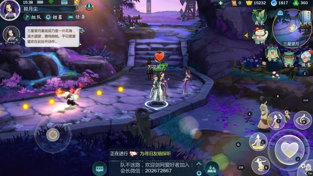 当我们接近可攻略的侠客的时候,该侠客头顶会冒出一枚爱心,而互动交流键标志同样会成为爱心,游戏玩家与之会话即可察看该侠客的具体内容,而且赠予礼品给TA,提高好感度。