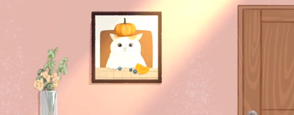 解压泡泡:将泡泡压破之后将桌子上的物语花放好,最后小猫的游戏照片挂在墙上。