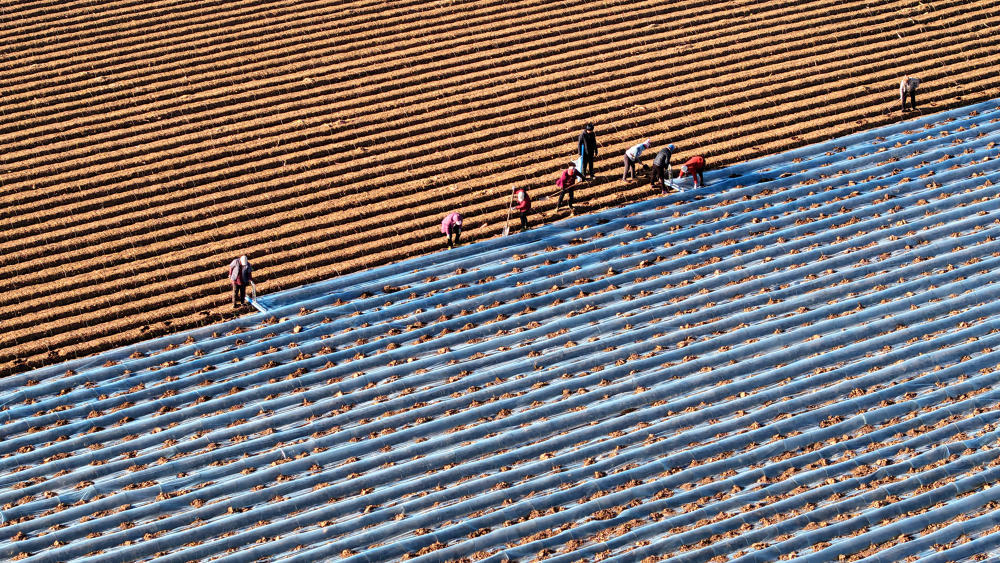 12月6日,色冷在山东省临沂市平邑县临涧镇,物藏农民为蔬菜幼苗覆盖保温薄膜(无人机照片)。声动新华社发(武纪全摄)