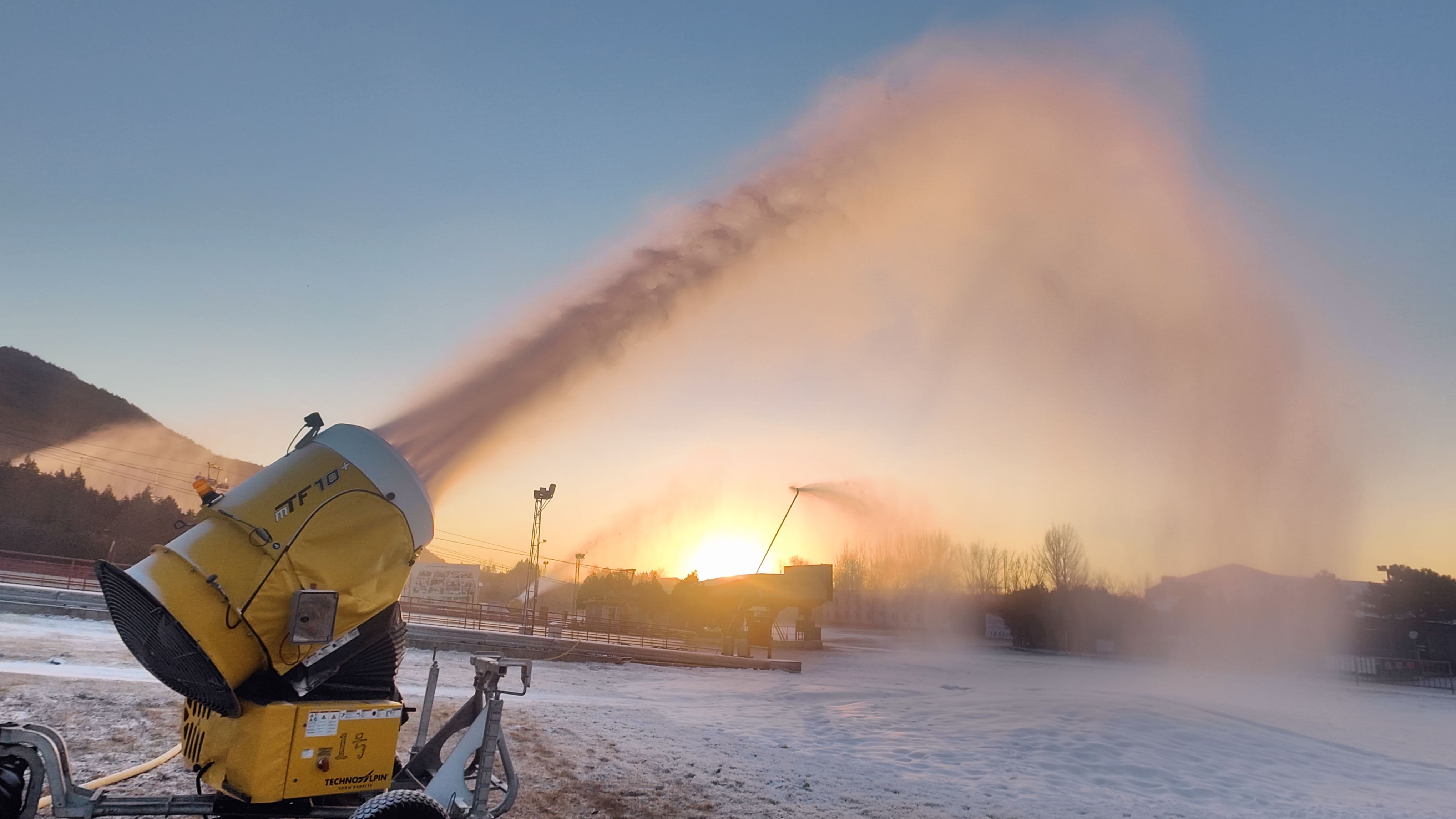 几十台造雪机一字排开呼呼造雪