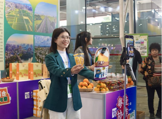 活动现场,田阳粤桂协作展区,参展企业的工作人员架起手机,现场当起了主播,一边向镜头展示圣女果、芒果干等优质产品,一边热情地与线上观众互动,实时解答关于产地、口感、购买方式的问题。