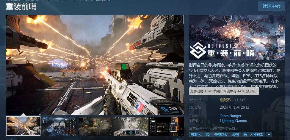 截至目前《重装前哨》在Steam上已有1070条评测,玩家好评率44%,整体为“褒贬不一”。国区843条,好评率39%。由Team Ranger制作的塔防建造FPS游戏《重装前哨》现已在Steam上推