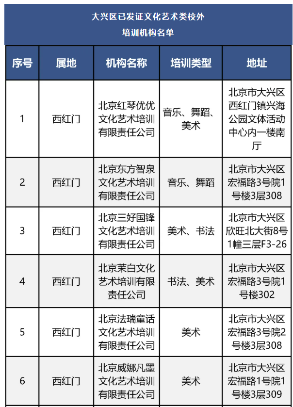 北京大兴区《非学科类校外培训机构培训许可证》白名单机构名单(部分)。图/北京市教委官方微信公众号“首都教育”