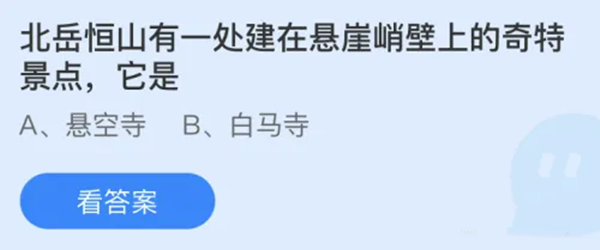支付宝蚂蚁庄园小课8月21日的其中一个问题是:北岳恒山有一处建在悬崖峭壁上的奇特景点,它是?这道题考查了恒山有关的知识,下面一起来看一下蚂蚁庄园8月21日的正确答案吧。蚂蚁庄园小课堂8.21问题答案: