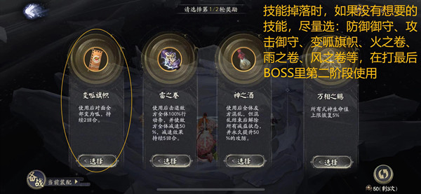 4、选技能很重要,柔风抱暖一定要优先5级、其次是细雨化屏5级!打鏖战掉1个技能,打混沌精英掉2个技能,神秘可能是复制或随机转换技能,所以很考验路线规划,优先选宁息之所,再考虑混沌,前期先打鏖战会掉金币,有金币才能去宁息之所买技能。妖力化身前期不能装,会导致千姬放不下锤子,要打boss的之前才装。