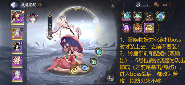 5、打boss时技能:鲤鱼精锁二技能,蟹姬铃鹿御前锁普攻,其他开妖术。