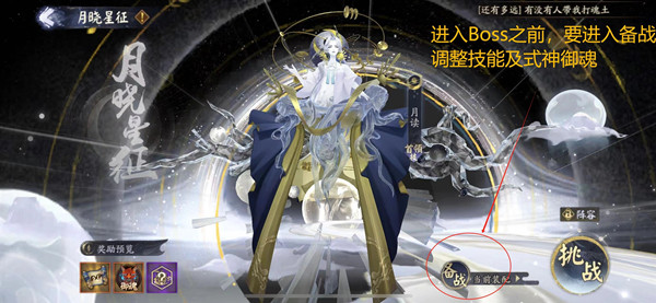 3、进入boss战之前一定要进入备战,把召唤物妖力化身装上去、把双输出都改成6号位攻击加成,进入boss战后双输出第一时间要改普攻!等bos二阶段时,点右上角的旗帜,优先点攻击、防御、最后才是解控(雨之卷)。