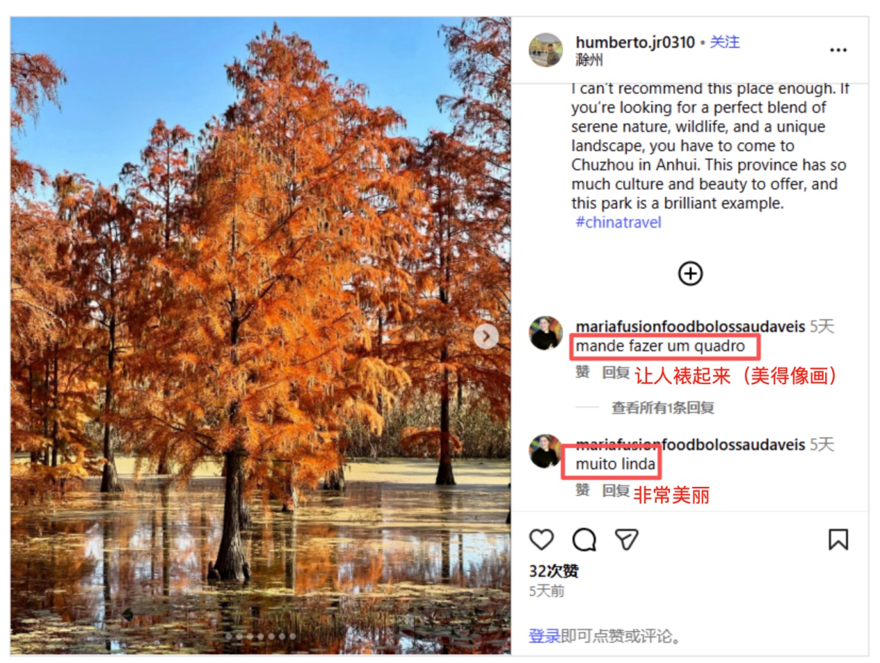 初冬时节的池杉湖国家湿地公园,黄红相间的池杉林与宁静的湖面交相辉映,黑天鹅等各种鸟类在水面嬉戏觅食,这个童话般的世界,让网红博主们沉醉其中。埃及网红博主感叹这里的生态环境保护得如此到位,“人与自然相处得这么和谐,真的太治愈了”。