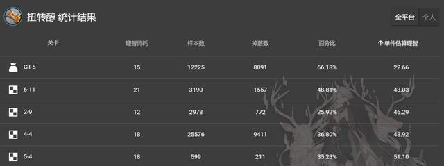 2、扭转醇:别名扭扭抑或口香糖,新主线关卡6-11成为了最优建议,单独估计损耗43理智。为什么不刷2-9以及5-4,由于他们理智损耗得差不多,却不会掉下更高级的紫色原料。