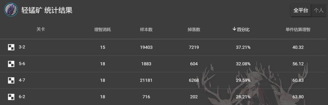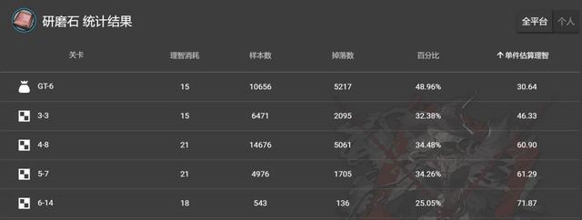 3、研磨石:别名厚钢板,仍旧建议关卡4-8,单独估计损耗61理智。为什么不刷5-7,由于不会掉下更高级的紫色原料。然而假如独自需要深蓝色原料,能够刷3-3,单独估计损耗46理智。