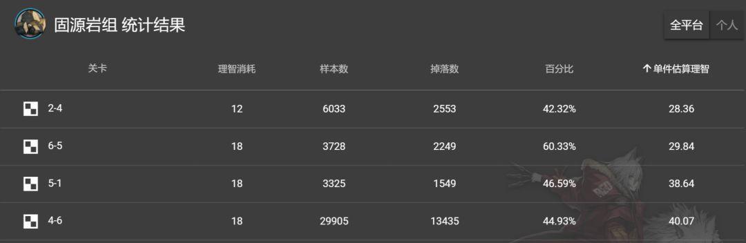 5、固源岩组:别名石块,建议由1-7产出的初级石块“固源岩”开展组合。由组合来看,估计单独固源岩组损耗24理智。假如不愿组合,能够刷关卡2-4或新章节的6-5,单独估计损耗30理智。