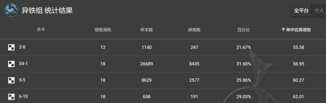 8、异铁组:别名铁块,建议关卡S4-1,单独估计损耗57理智。铁块相对玄学,四图的紫色铁掉率会高一些。这儿不建议各位为了独自刷铁块去2-8,由于尽管盼望的理智少了1,然而失去了出高级原料的大概,因小失大。
