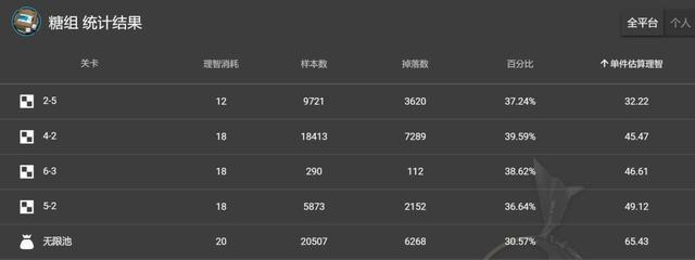 糖聚块:建议关卡4-2,估计损耗理智454。5-2也掉下,损耗557。