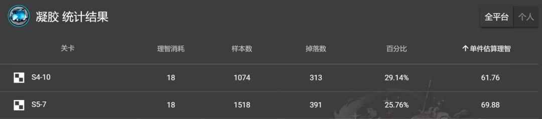 11、凝胶:别名果冻,建议关卡S5-7,单独估计损耗70理智。新原料仍旧很迷,四图的掉率要高过五图,不算太懂鹰角怎么创作的。尽管四图的S4-10单个损耗62理智,然而失去了出高级原料的几率,小编觉得不值得,因此建议五图。