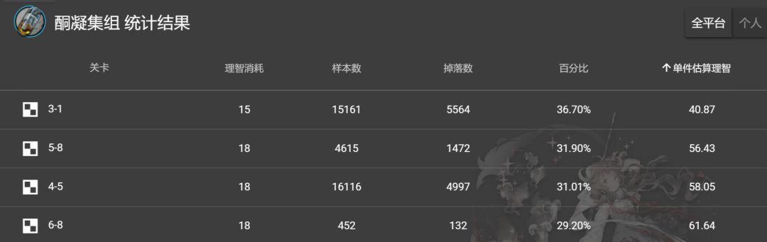 酮阵列:建议关卡4-5,估计损耗理智508。5-8也掉下,损耗590。