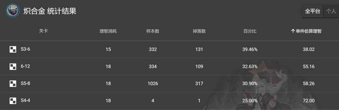 炽合金块:建议关卡S5-8,估计损耗理智401。6-12也掉下,损耗601。