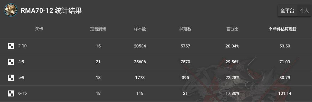 4、RMA70-12:别名星极、圣宝石抑或核桃,建议关卡4-9,单独估计损耗71理智。不刷五图的关系和以前一样。然而假如独自需要深蓝色原料,能够刷2-10,单独估计损耗53理智。