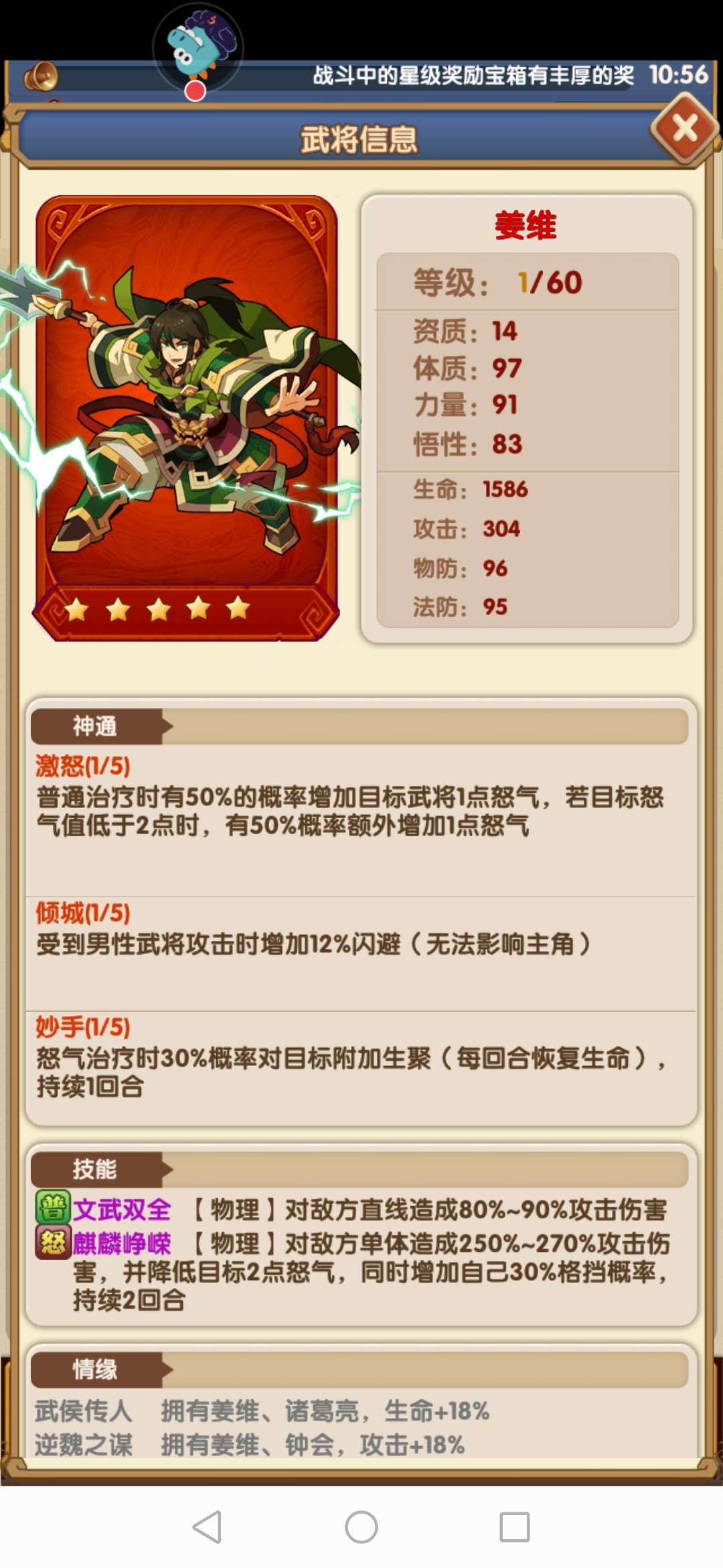 姜维的麒麟峥嵘可以对单体目标进行攻击,并且提升自身格挡率,属于前排输出武将,而且就姜维还有一个特点就是对男性武将攻击有闪避加成,这对于目前男性武将占大多数的环境下非常有优势,关键时候也能左右肉盾使用。