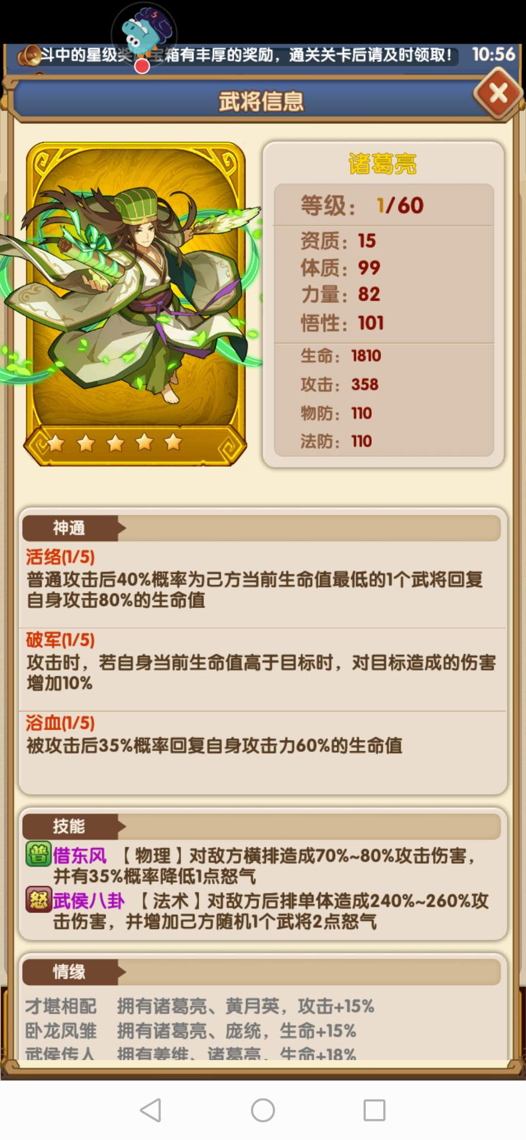 诸葛亮属于资质15点的金色武将,怒气大招可以对敌方后排造成大量伤害,并且增加己方怒气,诸葛亮在阵容中的作用就是后排杀手和主力输出,和姜维组合后增加18%的血量,这个组合中既有治疗又有肉盾,而且张飞的自我恢复能力非常强悍,基本上不会出现被秒杀的情况,配合刘备的奶量可以应付绝大部分活动,对装备要求也不是太高,适合小R玩家使用。