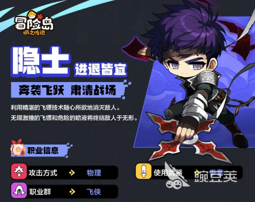 第二个角色是冒险家阵营中的【隐士】,隐士很擅长远距离作战,使用的武器是卷套,会像敌人投掷出大量的飞镖,攻击带有刺客标记的敌人时,周围会迸发出飞镖,攻击附近的敌人。这个角色在游戏中是属于物理攻击的,职业群体是【飞侠】,会利用精湛的飞镖技术随心所欲地消灭敌人。这个角色的属性面板上来看输出和机动性是最高的,同时难度也是非常的大,主属性是【幸运】,副属性是【智力】,这就意味着在装备选择方面有了一个非常清晰的路线!