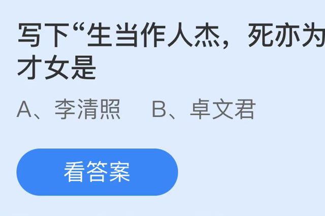 问题1:写下“生当作人杰,蚂蚁死亦为鬼雄”的庄园最新著名才女是?