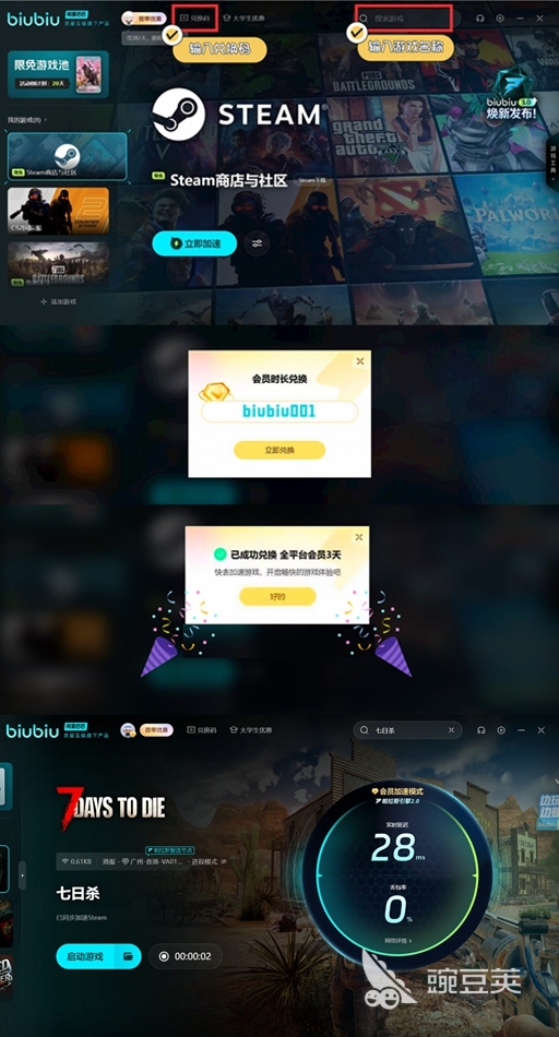 从这里就可以看到这款游戏真的介绍比较精彩,但要想在游戏中尽情的体验,避免游戏卡顿,可选择一款加速器。现在还有双重福利。新老用户使用兑换码【biubiu001】可以接受72小时免费加速时长,对新用户而言,在完成注册之后就能拿到24小时免费加速时长,结合兑换码一起使用,一共是免费96小时。【从8月5号开始《七日杀》游戏还会有限时免费加速,结束的时间主要是以biubiu端内作为标准,趁着免费加速期间,玩家可以尽情的体验。】
