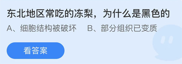 支付宝蚂蚁庄园小课堂12月8日的其中一个问题是:东北地区常吃的冻梨,为什么是黑色的?这道题考查了关于冻梨的知识,下面一起来看一下蚂蚁庄园12月8日的正确答案吧。蚂蚁庄园小课堂12.8问题答案:问题:东