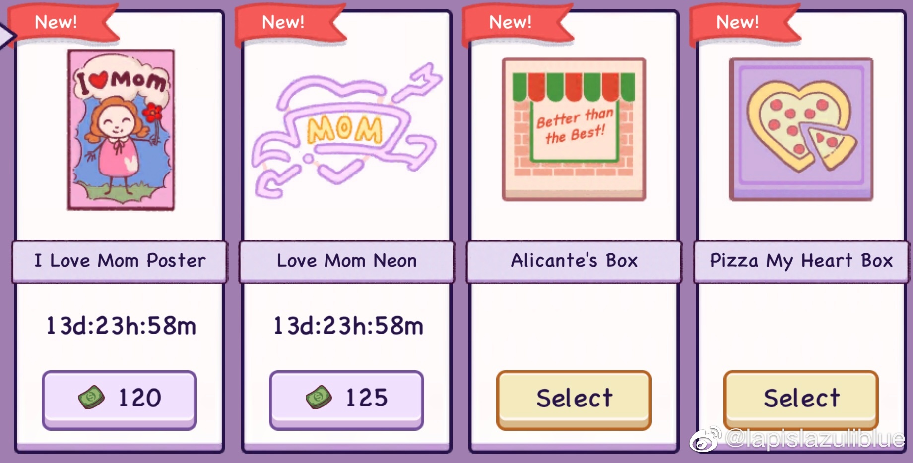 3、萨母p9和p10是亲节今年的母亲节新装饰。但是装饰需要在左侧菜单具体点击“盒子”“桌面摆设”等才能看到(不在母亲节那一栏里) 共计980披萨币+29钻石