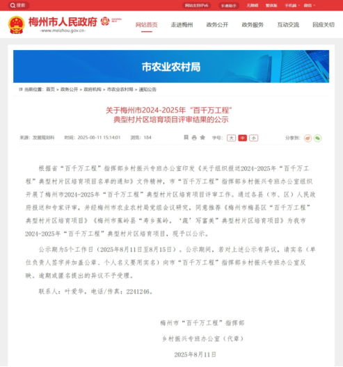 作为广东省“百千万工程”典型村片区培育工作的重要实践,梅州市此次入选的两个项目将通过集中资源培育,探索乡村高质量发展的有效路径,助力梅州在“百千万工程”“三年初见成效”目标中展现更大作为,为全省乡村振兴和城乡区域协调发展提供可借鉴的“梅州经验”。