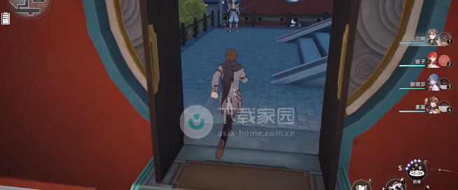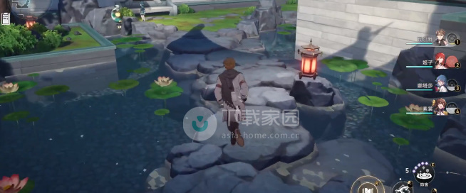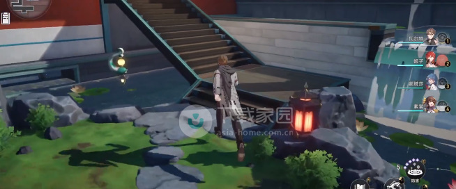 4、此时玩家可以向后面转,一直走直到看到一个左转的道路,然后拐进去,再穿过一片荷塘继续向前走,会看到旁边有楼梯,从楼梯上上去,在楼梯右侧的角落就可以找到机巧鸟了;